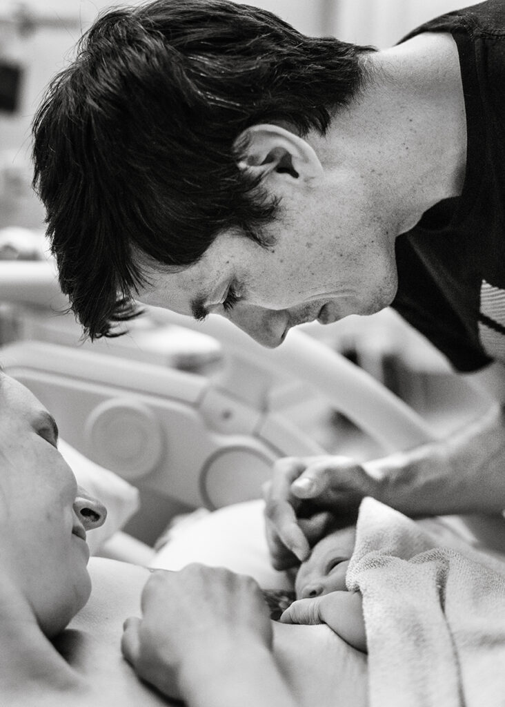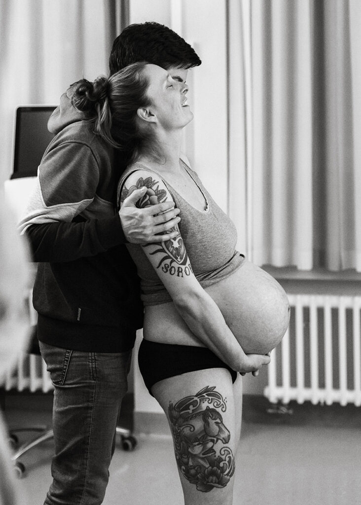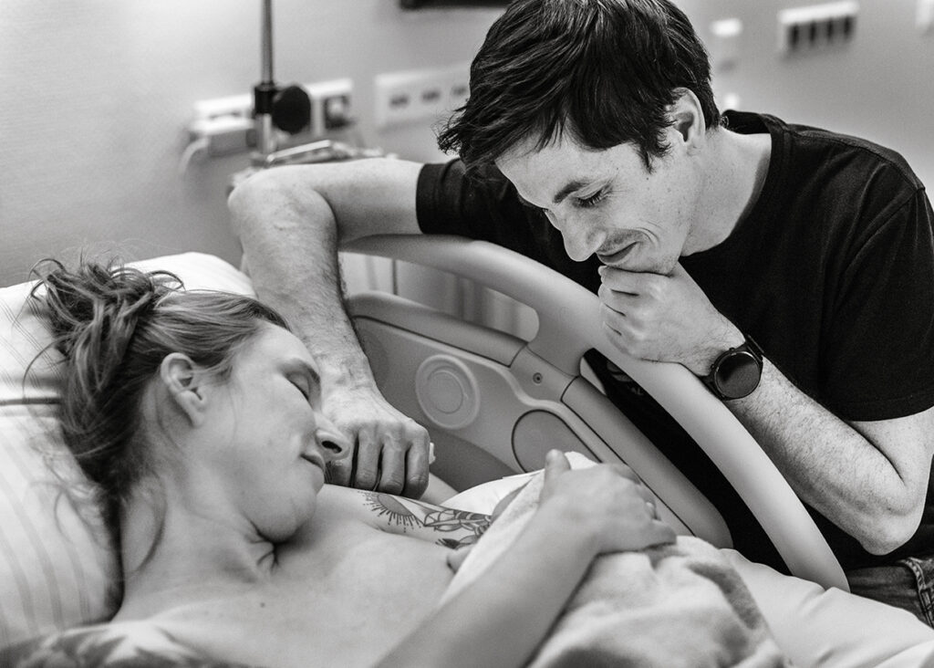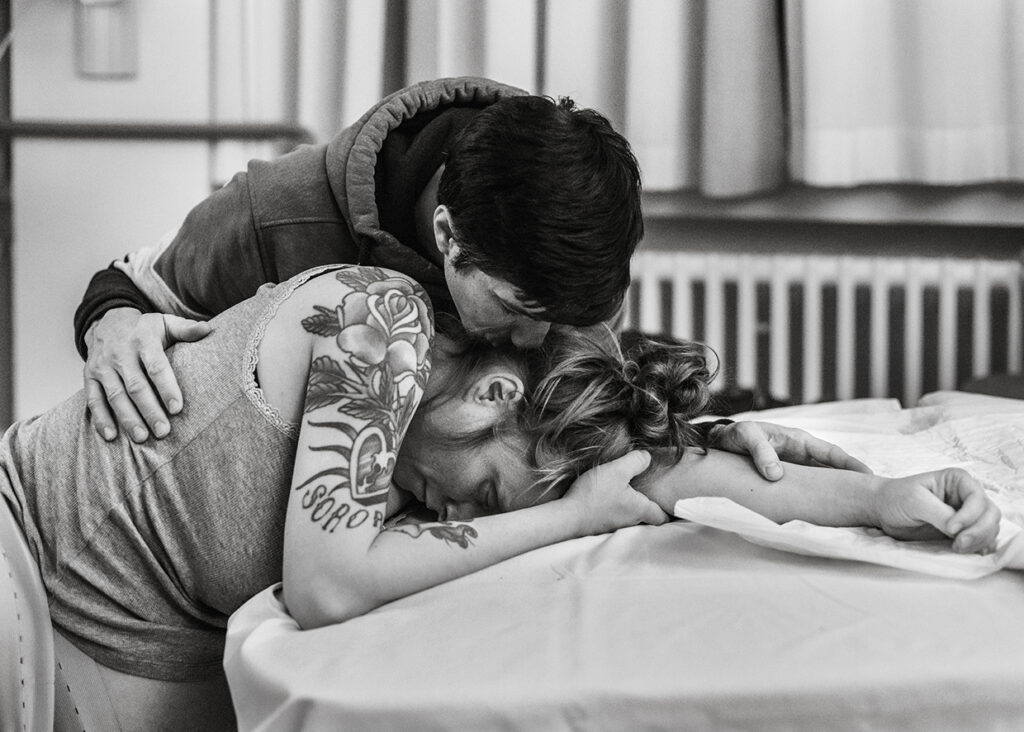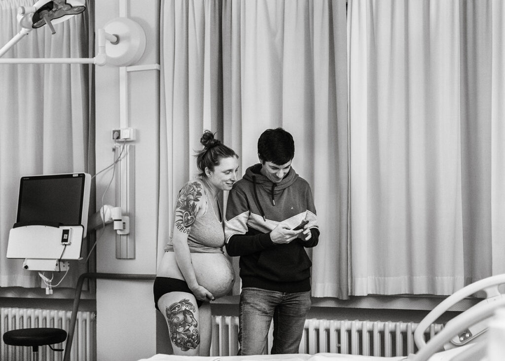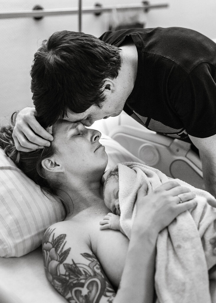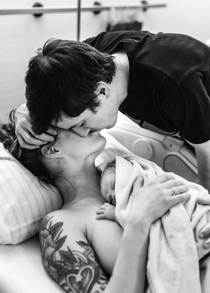 Nach den ersten Untersuchungen ging es direkt in den Kreißsaal. Anfangs wurde zwischen den Wehen viel erzählt, gelacht, Musik gehört und dazu gesungen. Dann wurden die Wehen immer intensiver, es wurde immer ruhiger und fokussierter. Schon bevor das kleine Wunder auf der Welt war, war die Liebe der beiden so präsent in all den kleinen und großen Gesten.