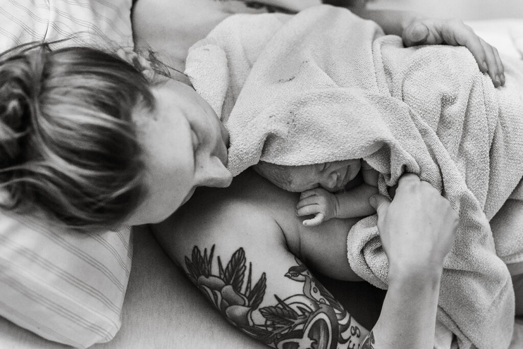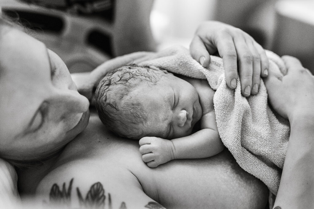 Die Mama war mittlerweile voll mit den Wehen beschäftigt und arbeitete sich Stück für Stück zu ihrem Baby voran. Die wundervolle Hebamme hat mit ihrer ruhigen Art, Massagen, bekräftigenden und hilfreichen Worten die gesamte Geburt so toll unterstützt. Nach weiteren kraftvollen Wehen war es soweit und sie meinte – „Gleich ist das Baby da“. In diesem Moment kullerten mir schon ein paar Tränen über die Wange. Dieser Moment, als die Mama ihr Baby entgegennehmen und das erste Mal halten konnte, war einfach magisch.